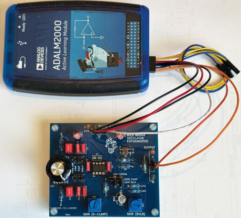 注意初始瞬態(tài),此時(shí)電路正在尋找恰當(dāng)?shù)姆纫跃S持振蕩。雖然該電路可在試驗(yàn)板上搭建,但鑒于已進(jìn)展到這一步,不妨制作一個(gè)更可靠、能長期使用的版本。圖8展示了連上ADALM2000的完整PCB。