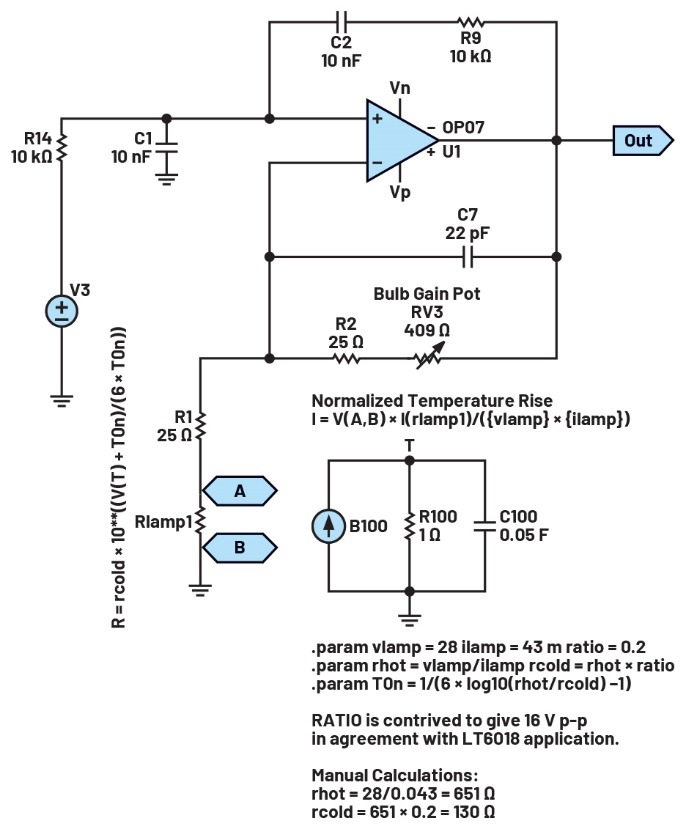 下面,我們來對(duì)本系列第一部分的圖1電路進(jìn)行改進(jìn)。#327白熾燈泡是一個(gè)28 V指示燈,其冷態(tài)電阻約為130 Ω,熱態(tài)電阻約為650 Ω。在LTspice中,可將該燈泡建模為一個(gè)電阻元件,其阻值是功耗的函數(shù)。然而,該阻值不能瞬間改變,如果該阻值能瞬間改變,當(dāng)輸出正弦波從零上升到最大幅度、再回落到零并轉(zhuǎn)向最大負(fù)幅度的時(shí)侯,放大器的增益也會(huì)隨之同步改變,導(dǎo)致輸出波形出現(xiàn)失真,而這顯然不是我們想要的。