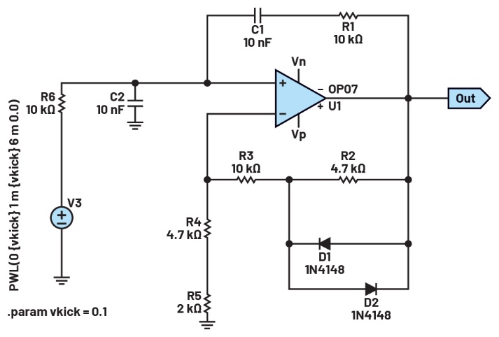 在LTspice中打開wien_bridge_osc_complete.asc,然后運(yùn)行仿真。輸出應(yīng)與圖2中的仿真結(jié)果類似。仿真開始后,V3激勵(lì)電路會(huì)立即向電橋施加0.1 V、5 ms的脈沖。該激勵(lì)電路對(duì)于啟動(dòng)仿真而言并非必需,但它有助于仿真更快達(dá)到穩(wěn)態(tài)。若沒有該激勵(lì)電路,仿真最終仍會(huì)開始,但模型中放大器的低失調(diào)可能會(huì)引起顯著的延遲。在一些實(shí)際應(yīng)用中,啟動(dòng)時(shí)間也是一個(gè)問題。為此,可以采用類似于V3的電路,例如由邏輯門構(gòu)成的脈沖發(fā)生器。請(qǐng)使用不同的vkick值(包括0)進(jìn)行實(shí)驗(yàn)。