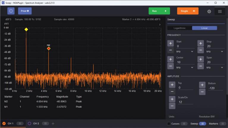 這個(gè)正弦波看起來很完美,但其完美程度究竟如何呢?能否用肉眼發(fā)現(xiàn)其中的任何失真?在時(shí)域(示波器)圖中,肉眼幾乎無法察覺到失真。即使與完美的參考正弦波進(jìn)行比較,小于1%的失真也很難被觀察到。要真正分析低水平的失真分量,必須使用傅里葉變換技術(shù),而這正是Scopy頻譜分析儀的核心功能。打開頻譜分析儀,將起始頻率(Start frequency)設(shè)置為0 kHz,停止頻率(Stop frequency)設(shè)置為20 kHz,頂部(Top)設(shè)置為0 dB,底部(Bottom)設(shè)置為-120 dB。重要提示:點(diǎn)擊通道1 (Channel 1)設(shè)置,選擇Blackman-Harris窗口,并將增益模式(Gain Mode)設(shè)置為高(High)。