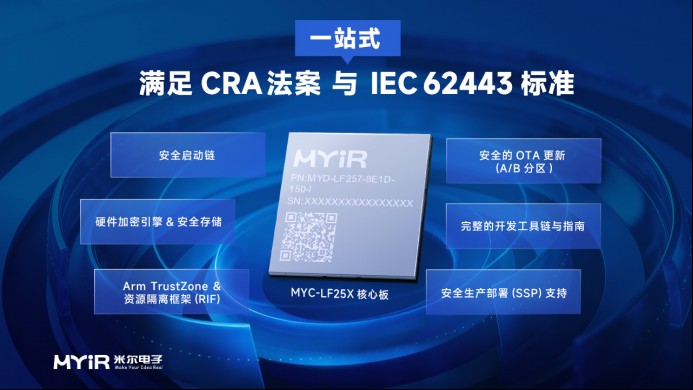 CRA法案要求聯(lián)網(wǎng)產(chǎn)品具備“內(nèi)置安全”、漏洞可管理和更新可持續(xù)的能力。IEC 62443標準,特別是其 IEC 62443-4-2(組件安全要求),則為實現(xiàn)這些目標提供了具體、可落地的技術(shù)框架。MYC-LF25X(米爾STM32MP257核心板)的設(shè)計與生態(tài),直接回應(yīng)了這些核心訴求:
