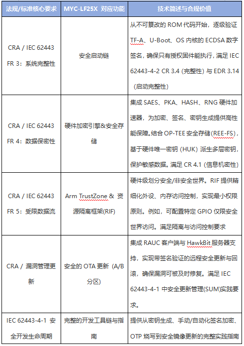功能與標準的直接映射:MYC-LF25X的每項安全功能,都精準對應(yīng)IEC 62443-4-2中的關(guān)鍵組件要求(CR)和嵌入式設(shè)備要求(EDR),讓合規(guī)不再是紙上談兵。
