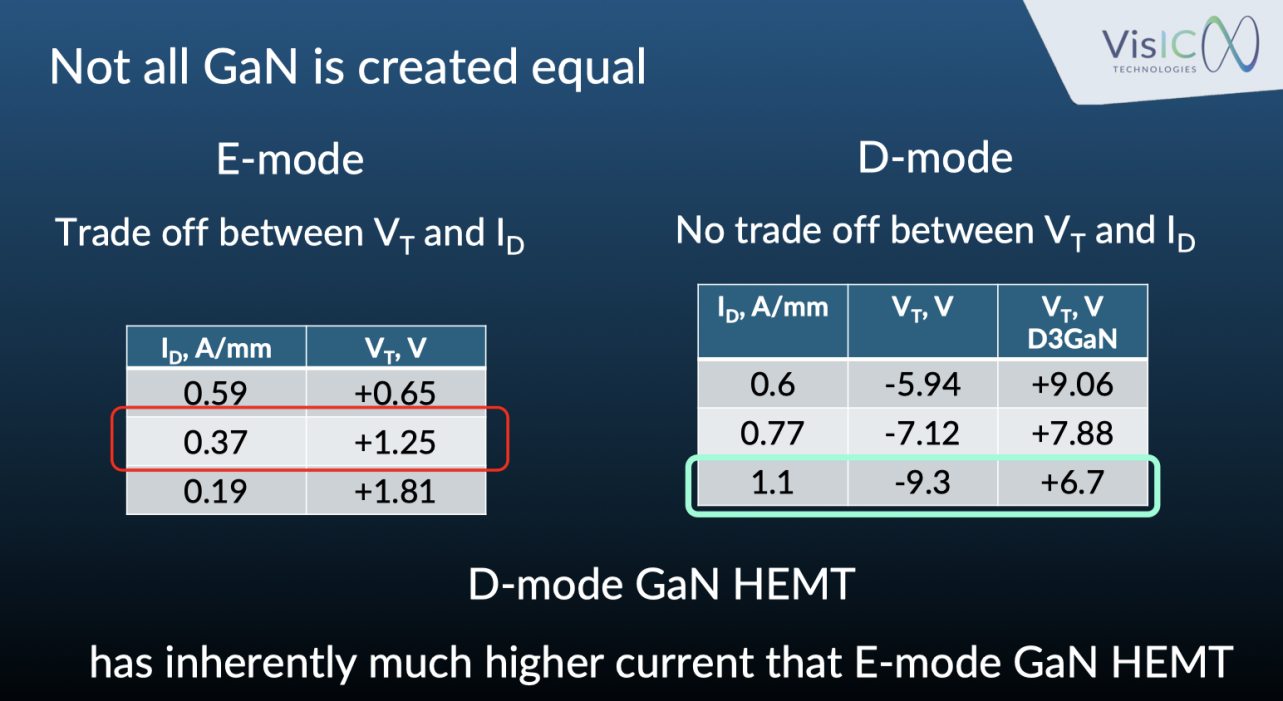對于業(yè)界長期困擾的電流與閾值電壓的平衡問題,VisIC所推崇的D型(D-mode)路徑展現(xiàn)了獨(dú)特的優(yōu)勢。DR.Tamara Baksht指出:“對于硅以及碳化硅而言,在電流和閾值電壓方面沒有辦法去調(diào)節(jié)或者妥協(xié)的,但是在氮化鎵方面就可以,比如E-mode模式之下,如果你想要大電流,閾值電壓會下降。對于D型其實(shí)也一樣,但在D型這邊有方法可以將閾值電壓解耦,可以專注來調(diào)整電流。這樣的我們可以同時(shí)大電流以及高的閾值電壓?!?