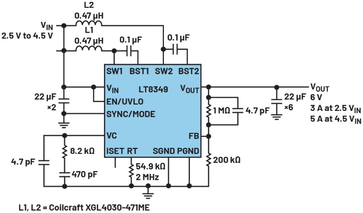 LT8349是一款單芯片同步升壓轉(zhuǎn)換器,內(nèi)置兩個(gè)以錯(cuò)相方式切換的N溝道MOSFET功率級(jí)。這些功率開關(guān)的額定參數(shù)為8 V/6 A,采用固定開關(guān)頻率工作,頻率可在300 kHz至4 MHz之間設(shè)定,也能同步至外部時(shí)鐘。同步整流技術(shù)可在寬負(fù)載范圍內(nèi)提升效率,有效降低功率損耗與散熱需求;而Stage Shedding?技術(shù)與可選的Burst Mode®模式則有助于改善輕載條件下的效率表現(xiàn)。