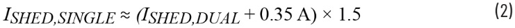 在重載條件下,LT8349作為兩相升壓轉(zhuǎn)換器工作。隨著負(fù)載電流減小,各相的電感峰值電流也隨之降低。當(dāng)峰值電流降至約1.7 A的卸載閾值ISHED,DUAL時(shí),Stage Shedding技術(shù)被激活,器件將從兩相升壓模式切換為單相升壓模式。在此工作模式下,第二相被關(guān)閉,第一相的電感峰值電流限值將提升至ISHED,SINGLE(由公式2確定)。