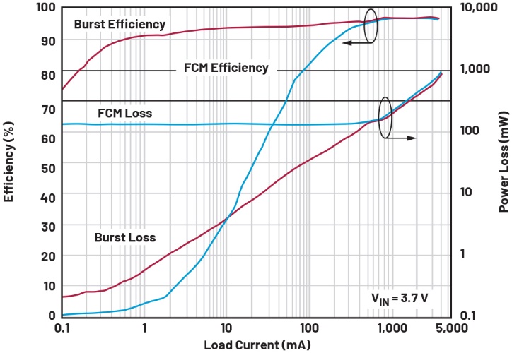 當(dāng)SYNC/MODE引腳懸空時(shí),這款I(lǐng)C在輕載條件下以FCM模式工作。在此模式下,電感電流允許變?yōu)樨?fù)值,使這款I(lǐng)C能夠在所有負(fù)載范圍內(nèi)按編程頻率進(jìn)行切換。這一特性可確保開關(guān)諧波和EMI的一致性與可預(yù)測(cè)性,但代價(jià)是輕載效率有所降低。圖3展示了突發(fā)模式和FCM模式之間的效率對(duì)比。