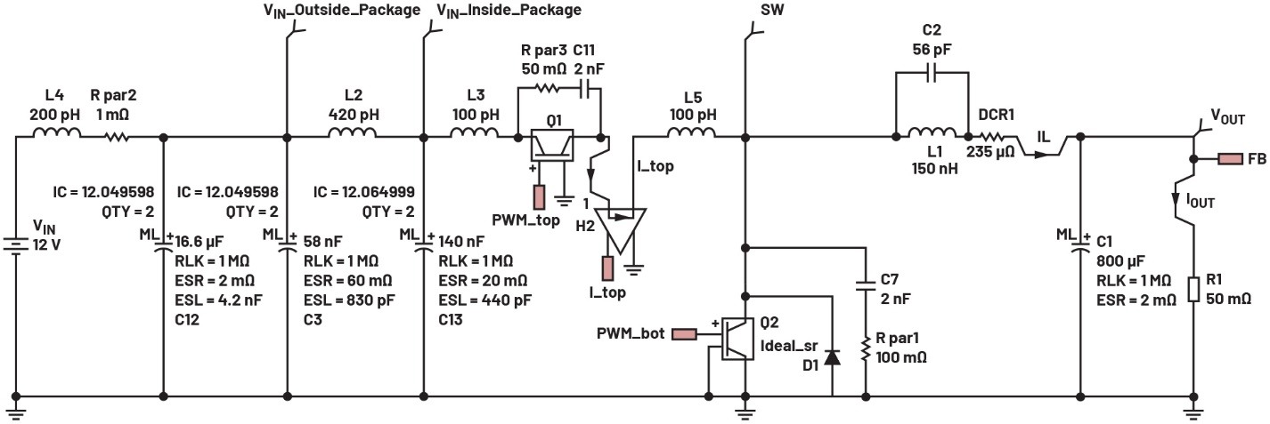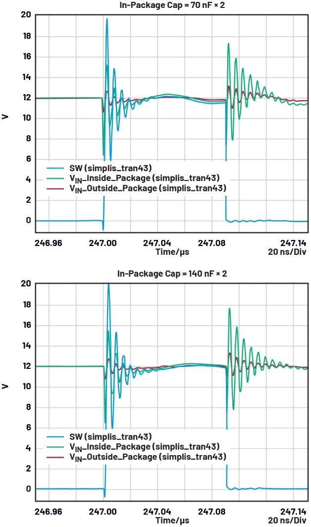 SIMPLIS仿真是一個有用的工具,可幫助工程師更好地確定CIN的最優(yōu)值。圖9顯示了一個降壓型穩(wěn)壓器,標出了沿電源走線的寄生電感估計值。輸入電容已根據(jù)12 V輸入電壓下陶瓷電容的直流降額進行了調(diào)整。如果輸入電容翻倍,從2x70 nF增加到2x140 nF,振鈴會得到改善(見圖10)。