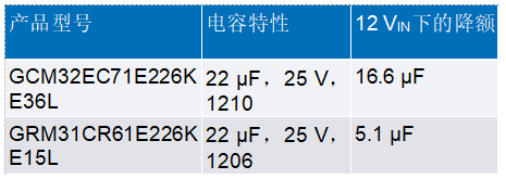對于輸入電容的選擇,由于陶瓷電容具有較大的直流額定范圍,因此工程師還應(yīng)注意直流降額。例如,比較12 V下1206和1210電容的直流降額,1206尺寸電容的降額更嚴重。表2列出了兩個Murata電容作為示例。因此,建議使用1210尺寸電容作為低電壓、大電流電源的輸入。
