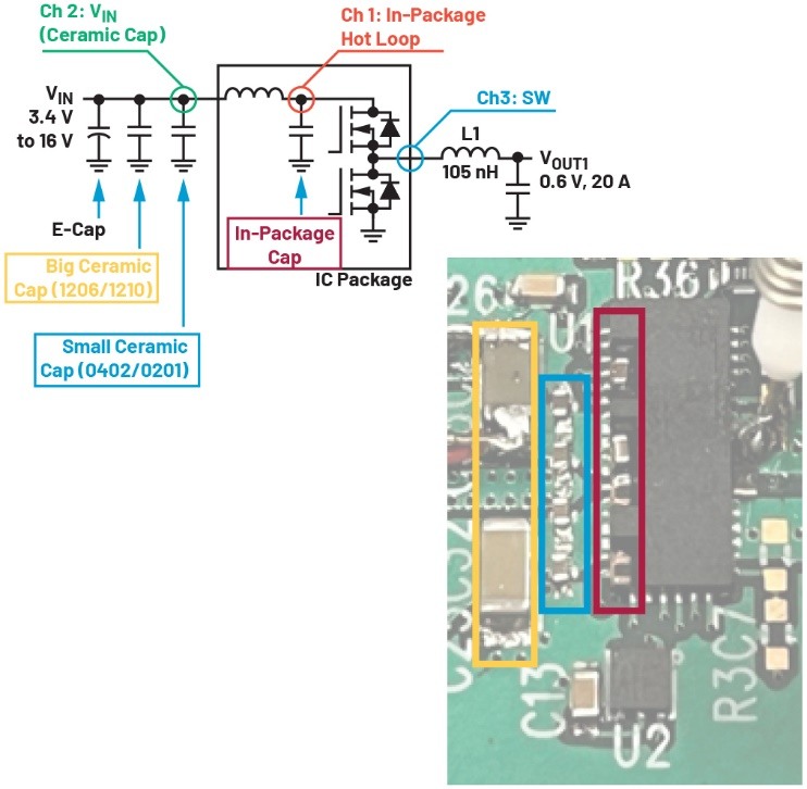 圖6(從左到右)顯示了用于熱插拔和抑制浪涌電流的電解電容,大陶瓷電容(通常為1210或1206尺寸)用于減少輸入電流紋波,而小陶瓷電容(0402或0201尺寸)用于減少高頻紋波。除此之外,Silent Switcher® 2技術(shù)會將一對電容嵌入封裝中,以進一步減少SW高頻噪聲和過沖。圖6右側(cè)圖片顯示了兩個1206陶瓷電容(黃色)、四個0402封裝外陶瓷電容(藍色),外加四個采用去封裝技術(shù)的0402封裝內(nèi)電容(紅色)。封裝中裸片上方刻蝕一個孔,以暴露襯底上的封裝內(nèi)電容。