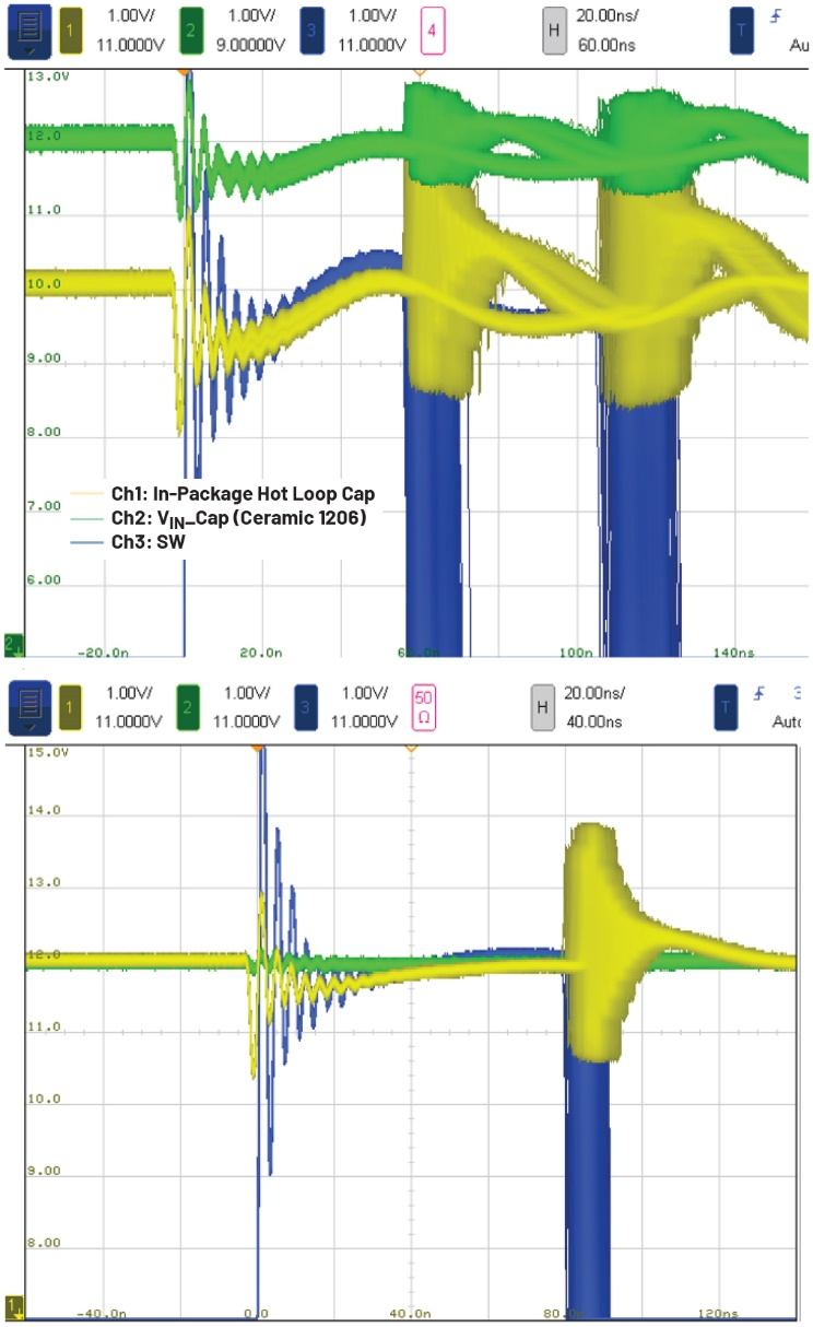 圖7.輸入紋波和SW波形:小CIN組合(上);大CIN組合(下)。