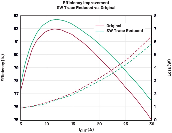 圖4顯示了基于測試結(jié)果的效率改進情況。在20 A和30 A負載條件下,損耗改善幅度分別為0.22 W和0.53 W。