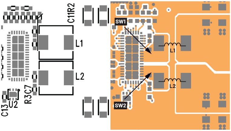 在之前版本的雙相器件演示板設(shè)計中,第1相和第2相中的電感相對而置,如圖1所示。如果電感以此特定方向放置,EMI性能會更好。這種方式的缺點是開關(guān)(SW)節(jié)點會有相對較長的走線,導致PCB走線損耗更大,尤其是在重負載條件下,因為導通損耗與電流值的平方成正比(P = I2R)。