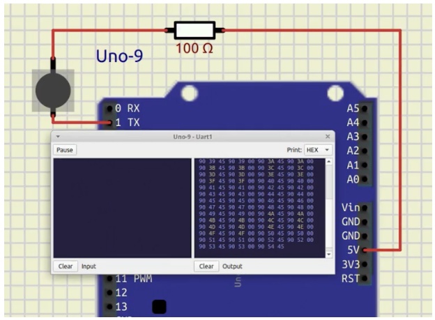 搭建這個(gè)電路,并將 MIDI 示例程序代碼上傳至電路板。我們的程序會(huì)在串行 TXD 線路上傳輸脈沖。模擬器會(huì)顯示所發(fā)送的位。這些脈沖的頻率太快(每秒 31,250 位)以至于我們無法看到 LED 的閃爍。