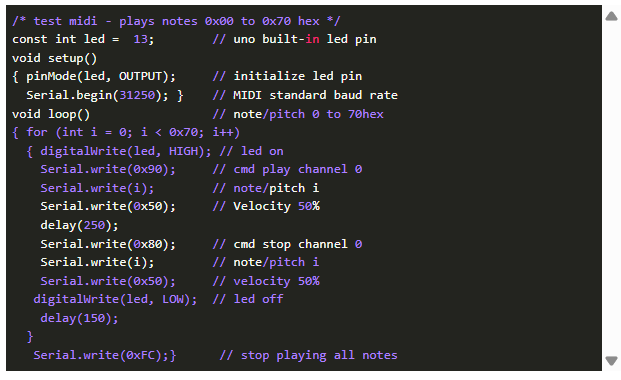 對于每個(gè)音符(i),我們都會(huì)發(fā)送一個(gè)命令,使其以半音量開啟,暫停后播放該音符,然后關(guān)閉該音符。Serial.write(0xFC) 是一個(gè)停止所有音符播放的命令。有時(shí)合成器會(huì)在未接收到停止命令的情況下播放音符。