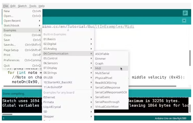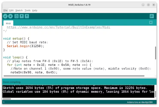 編譯以檢查代碼。此操作無需新的庫或附加文件。調(diào)用 Setup() 函數(shù)即可開啟 UART 電路,并通過 Serial.begin(31250) 設(shè)置默認(rèn)的串行波特率或速度(適用于 MIDI)。