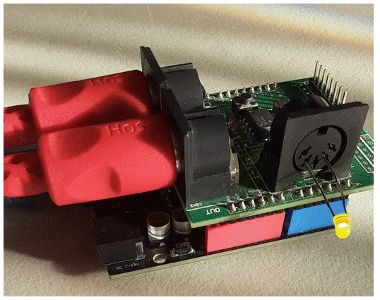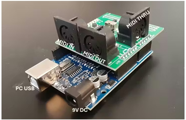 將你的護(hù)盾小心地連接到 Arduino 上。仔細(xì)對齊引腳并插入。UART 的發(fā)送和接收端口被引出至 DIN-5 連接器上,并在電路中添加了適當(dāng)?shù)碾娮琛N覀兊某绦騼H傳輸 MIDI,因此我們只使用 MIDI 輸出連接器。