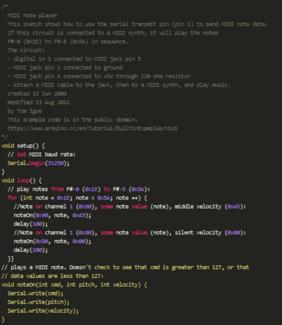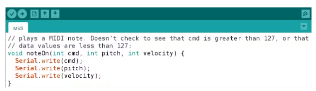 函數(shù) noteOn(int cmd, int pitch, int velocity) 接受三個(gè)整數(shù)參數(shù)。Serial.write(cmd) 發(fā)送第一個(gè)參數(shù),而 Serial.write(pitch) 和 Serial.write(velocity) 則說明要使該音符發(fā)出多大的音量。
