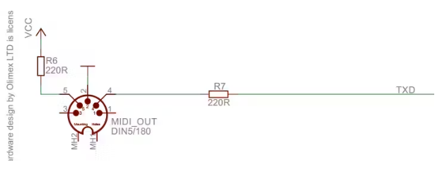 讓我們來看一下 Arduino MIDI 保護(hù)板的原理圖中的 MIDI OUT 端口。在這里,我們可以看到 TXD 電路由電阻器 R14 和 R15 維護(hù),每個(gè)電阻的阻值均為 220 歐姆。