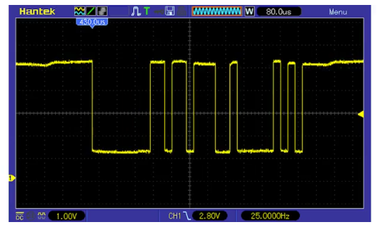 我們的波形速率為 31,250 波特。屏幕上的脈沖寬度是多少呢?Sparkfun 網(wǎng)站上有一篇關(guān)于 MIDI 字節(jié)如何組合的精彩教程。在這個(gè)腳本中發(fā)送的大多數(shù) MIDI 命令都需要 3 個(gè)字節(jié)。