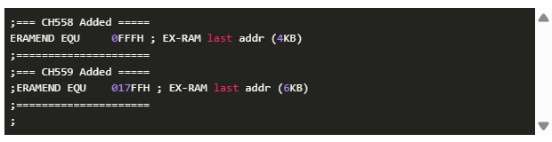另一個(gè)變化是,CH558 使用 4KB 內(nèi)部 xRAM,而 CH559 則使用 6KB 的 xRAM。CH558 和 CH559 的內(nèi)部 xRAM 范圍不同。CH558 的 xRAM 范圍從 0000H 到 0FFFH。因此,ERAMEND 的值為 0FFFH。這一數(shù)值也已修正,以報(bào)告正確的可用內(nèi)存。