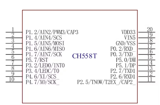 CH558 和 CH559 采用 T & L 封裝,其引腳數(shù)量更多(分別為 20 和 48),能夠運(yùn)行在 48 MHz 的頻率下,并且分別具有 4kb 和 6kb 的更大內(nèi)部 xRAM。
