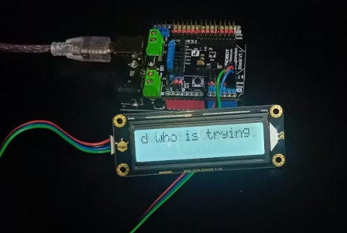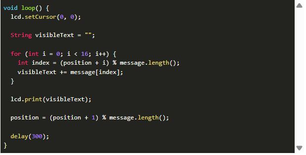 構(gòu)建完 16 位字符串后,該代碼會(huì)將其輸出到液晶顯示屏上,然后將位置向前移動(dòng)一個(gè)字符,并等待一段短暫的延遲。調(diào)整這個(gè)延遲時(shí)間會(huì)改變滾動(dòng)的速度。