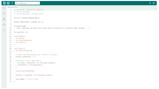 一旦硬件準(zhǔn)備就緒,就前往本系列的 GitHub 倉(cāng)庫(kù)。在描述中會(huì)找到相關(guān)鏈接。打開(kāi)第 14 課的文件夾,復(fù)制名為“test-lcd”的文件,并將其粘貼到你的 Arduino IDE 中。