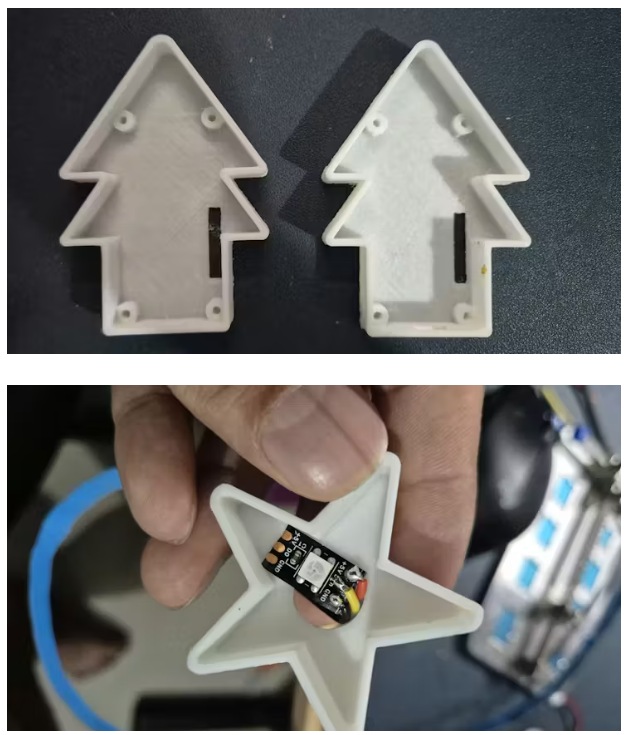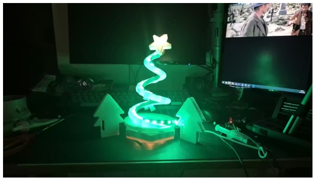 我只有不到一周的時(shí)間,所以首先我是在紙上設(shè)計(jì)了這個(gè)概念,并在 SolidWorks 軟件上制作了模型。然后用圓形管做成了 3D 打印品,管子呈螺旋狀。但我原本認(rèn)為很優(yōu)雅的螺旋形狀,最終卻變成了一個(gè)常見(jiàn)的棕色表情符號(hào)的樣子。這時(shí)我才意識(shí)到,我的機(jī)械工程思維完全凌駕于設(shè)計(jì)感之上。為什么?圓形截面在結(jié)構(gòu)上比矩形截面更穩(wěn)固,而且能呈現(xiàn)出更好的帶狀外觀。后來(lái)我在 Thingiverse 上也找到了一個(gè)螺旋結(jié)構(gòu)。我還是繼續(xù)自己重新設(shè)計(jì)了這個(gè)方案,但隨后 3D 打印過(guò)程出了問(wèn)題,導(dǎo)致材料被弄成了“意大利面狀”,我也沒(méi)有時(shí)間重新嘗試了。于是我就決定采用圓形管螺旋結(jié)構(gòu)。我把 LED 燈帶纏繞在其周?chē)?,并在頂部加上了一個(gè)星星裝飾。