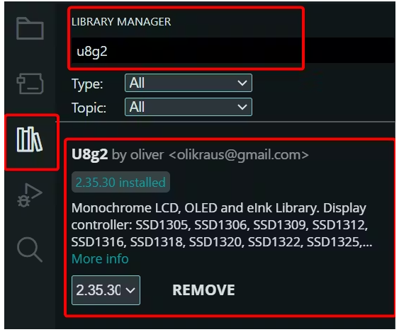 2.2 打開“圖書館管理器”,查找“U8g2”并下載它。