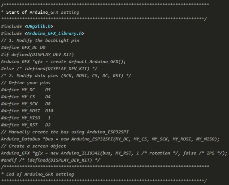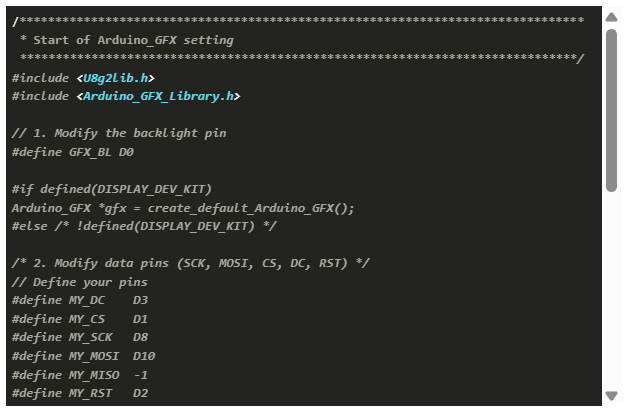 同樣,您需要將從“Arduino_GFX 設(shè)置的起始部分”到“Arduino_GFX 設(shè)置的結(jié)束部分”這一段進(jìn)行修改。