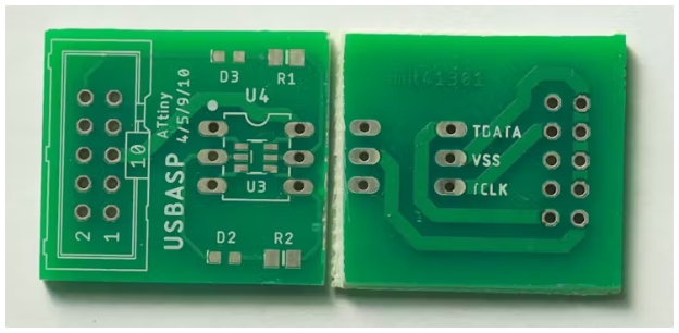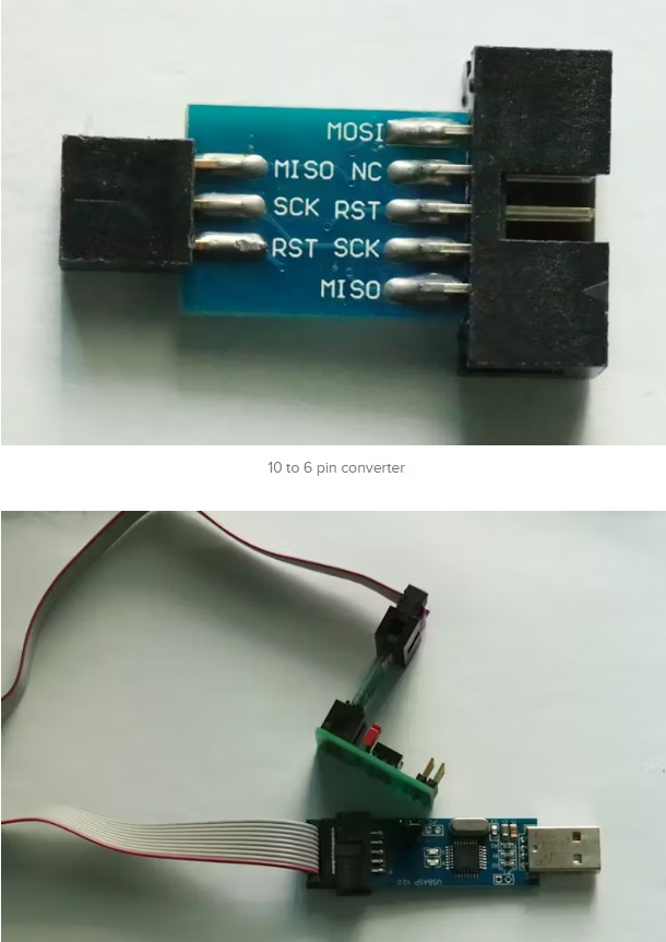 要將 USBasp 調(diào)試器連接到這個 6 針的目標(biāo)板上,我們需要一個 10 針到 6 針的轉(zhuǎn)換器。