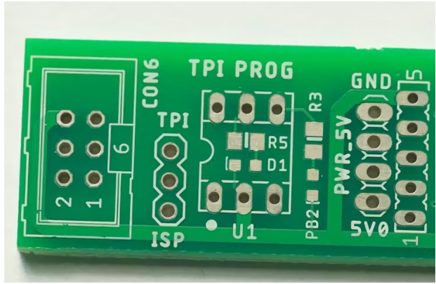 首先,位于 CON6 附近的紅色跳線器。如果我們使用的是 AVRISP MKII 或任何帶有 6 芯接口的專用 TPI 編程器,那么這個跳線器應(yīng)處于 TPI 位置。