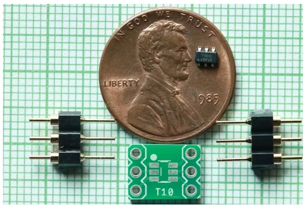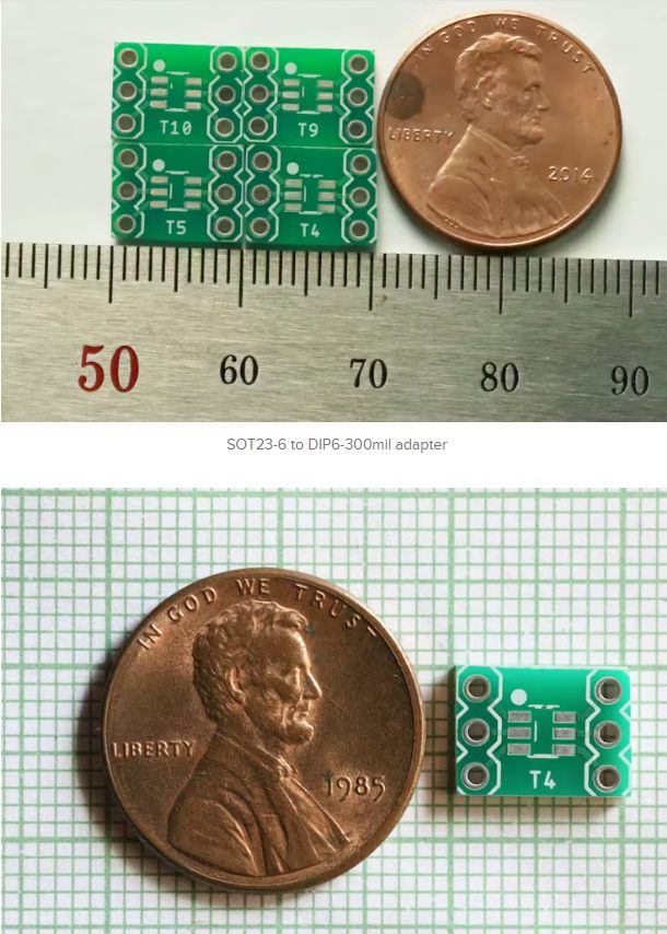 現(xiàn)在我們已將這些設(shè)備安裝在 DIP6 型號的 IC 適配板上。絲印上的設(shè)備標(biāo)識是可選的。這樣既便于閱讀也方便操作。第 1 個引腳有一個白色圓點的標(biāo)識。