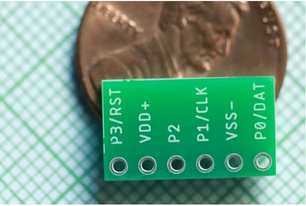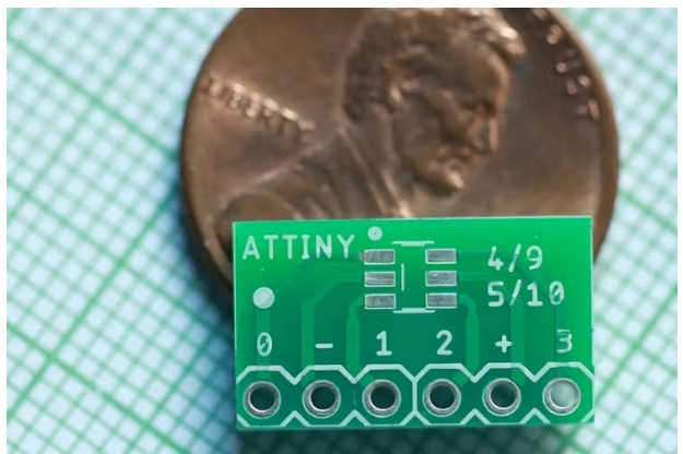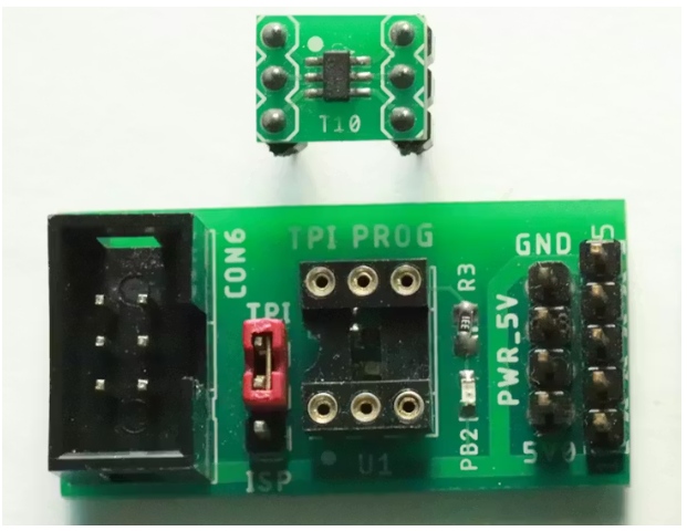 ATtiny4/5/9/10 系列芯片有兩種封裝形式。較為易于操作的是 SOT23-6 封裝。我們可以提供一個小型的適配板,用于將 SOT23-6 封裝轉(zhuǎn)換為 DIP6 300mil 封裝。我們能夠輕松獲得帶有銑削圓柱形引腳的 6 引腳芯片基板。您也可以從這里找到類似的板子,它同樣包含原理圖和布局文件。