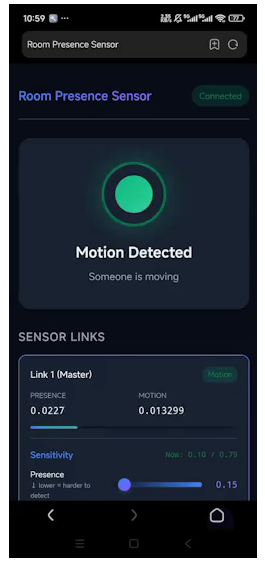 該項(xiàng)目包含一個(gè)托管在主 ESP32 上的簡(jiǎn)易網(wǎng)絡(luò)服務(wù)器。我在手機(jī)上打開了其 IP 地址。該界面很簡(jiǎn)單:有一個(gè)顯示“存在”、“清除”或“移動(dòng)”的狀態(tài)指示器,還有一個(gè)顯示信號(hào)變化情況的滾動(dòng)圖表。
