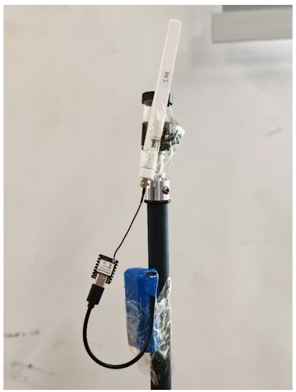 我搭建了一個(gè)合適的測(cè)試裝置。我把 XIAO 板安裝在三腳架上,將它們抬高至離地面 1.4 米的位置。至關(guān)重要的是,我斷開了 FPC 天線,并安裝了外部偶極子(桿狀)天線。