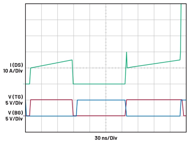 如果兩個(gè)開關(guān)同時(shí)完全導(dǎo)通(哪怕持續(xù)時(shí)間非常短暫),低RDS(ON)將造成VIN與GND之間短路,最終將導(dǎo)致開關(guān)徹底失效。如果兩個(gè)開關(guān)均處于部分導(dǎo)通狀態(tài),高漏電流將導(dǎo)致瞬時(shí)高溫,此現(xiàn)象會(huì)致使開關(guān)承受熱應(yīng)力,進(jìn)而縮短其使用壽命。這種情況就是所謂的“直通”(圖2)。在初始切換階段,大約有8 ns的死區(qū)時(shí)間,開關(guān)電流首先以正常di/dt速率達(dá)到輸入電流水平,隨后隨著電感充電而逐漸上升。下一轉(zhuǎn)換階段具有對稱的上升沿和下降沿,兩個(gè)晶體管可以同時(shí)處于部分導(dǎo)通狀態(tài),導(dǎo)致漏極電流出現(xiàn)明顯的尖峰,但仍低于I(DS)MAX。最后的轉(zhuǎn)換階段允許導(dǎo)通時(shí)間重疊2 ns,漏極電流尖峰遠(yuǎn)超F(xiàn)ET額定漏極電流。