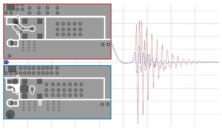 連接器本身是就是一種權(quán)衡的體現(xiàn)。表面貼裝MMCX連接器會(huì)占用電路板空間,這對于那些要求緊湊布局和高功率密度的設(shè)計(jì)而言,無疑是一個(gè)問題。如果連接器被(理想地)直接部署于FET的柵極和源極引腳之間,且不引入額外的柵極走線,這可能導(dǎo)致布局比預(yù)期更分散。另一方面,若將連接器放置在布局的邊緣,則會(huì)引入額外的走線電感和電阻,進(jìn)而降低測量準(zhǔn)確度。另一種方案是使用通孔接頭,這些接頭僅用于測量,在最終裝配時(shí)可移除。但是,這種方案需要借助適配器,不僅會(huì)略微增加寄生效應(yīng),還要在焊盤堆疊結(jié)構(gòu)的所有層上都預(yù)留環(huán)形開口。通過合理權(quán)衡各項(xiàng)因素并優(yōu)化電路布局,可有效抑制探頭寄生參數(shù)引起的過沖與振鈴(圖5)。紅框中的原始布局將MMCX連接器牢固連接到開關(guān)節(jié)點(diǎn),柵極節(jié)點(diǎn)通過通孔和內(nèi)部走線連接到GaN FET的柵極焊盤。紅色波形顯示振鈴幅度超過+6.4 V/–9.1 V。仍使用相同的2.2 Ω上拉/1.0 Ω下拉柵極電阻,但修改藍(lán)框中的布局,將MMCX本體與開關(guān)節(jié)點(diǎn)分開,代之以開爾文連接,由此測得的藍(lán)色波形顯示,頂部柵極關(guān)斷時(shí)的振鈴幅度降低至+2.4 V/–1.8 V。值得注意的是,即使只是對電路布局進(jìn)行些許調(diào)整,也可能顯著影響過沖的測量結(jié)果,而這一參數(shù)對于抑制過沖并避免GaN FET被過度驅(qū)動(dòng)至關(guān)重要。