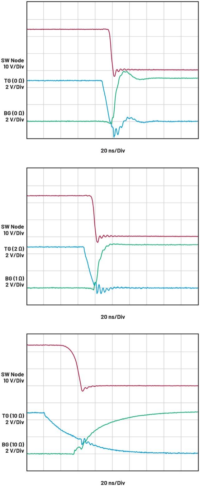 圖2.串聯(lián)電阻對柵極擺率(SW下降)的影響。TG:頂部柵極;BG:底部柵極。上方圖形顯示利用PCB走線進行柵極連接(0 Ω)的測量結(jié)果。中間圖形顯示優(yōu)化柵極電阻的測量結(jié)果。下方圖形顯示所有柵極皆有10 Ω電阻與柵極驅(qū)動引腳串聯(lián)的測量結(jié)果。對于SW節(jié)點下降,最關(guān)鍵的值是RTGPULL-DOWN。