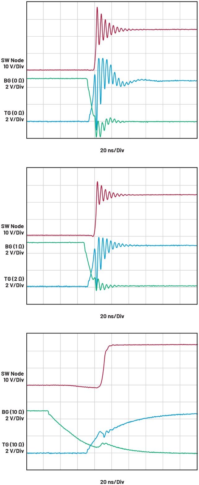 圖1.串聯(lián)電阻對柵極擺率(SW上升)的影響。TG:頂部柵極;BG:底部柵極。上方圖形顯示利用PCB走線進行柵極連接(0 Ω)的測量結(jié)果。中間圖形顯示優(yōu)化柵極電阻的測量結(jié)果。下方圖形顯示所有柵極皆有10 Ω電阻與柵極驅(qū)動引腳串聯(lián)的測量結(jié)果。對于SW節(jié)點上升,最關(guān)鍵的值是RTGPULL-UP。