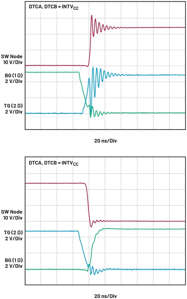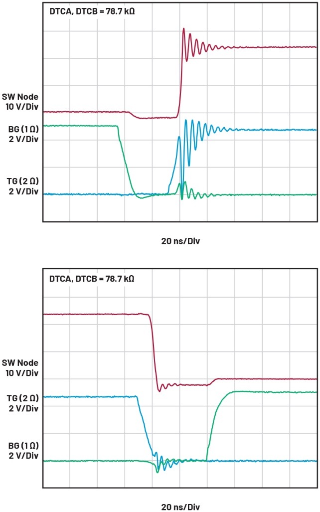 圖4.智能近零死區(qū)時間控制轉(zhuǎn)換,使用優(yōu)化的柵極電阻。請注意,使能此模式主動控制死區(qū)時間時,開關(guān)節(jié)點上沒有顯示可見的反向?qū)▍^(qū)域。