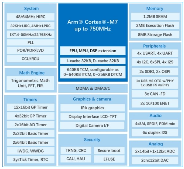 GD32H78E/77E、GD32H789/779系列MCU均基于性能強悍的Cortex®-M7內(nèi)核,主頻高達(dá)750MHz。該系列芯片擁有超高存儲配置,最高可支持2MB Execution Flash與8MB Storage Flash,并搭載1.2MB的SRAM,更特別配備高達(dá)640KB大容量緊耦合內(nèi)存(TCM),實現(xiàn)CPU同頻運行,指令與數(shù)據(jù)的零等待執(zhí)行。無論是高實時任務(wù)、復(fù)雜算法還是密集型數(shù)據(jù)處理,這一革新架構(gòu)可讓算力持續(xù)釋放,系統(tǒng)響應(yīng)更快、執(zhí)行更穩(wěn)。