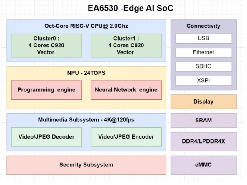特普斯微電子面向邊緣推理應用推出的EA6530 AI SoC,集成四個玄鐵C920高性能RISC-V CPU和24 TOPS的NPU,以及多媒體和安全子系統(tǒng)