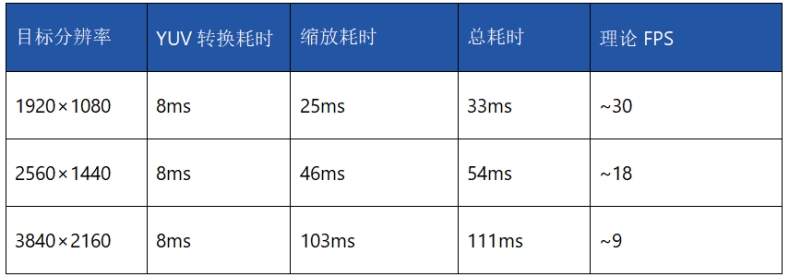 若要將攝像頭采集的 YUYV 格式數據直接顯示到屏幕,需先轉換為 RGBA8888 格式。在 CPU 上進行格式轉換與縮放的性能如下(輸入為 640×480 YUYV):