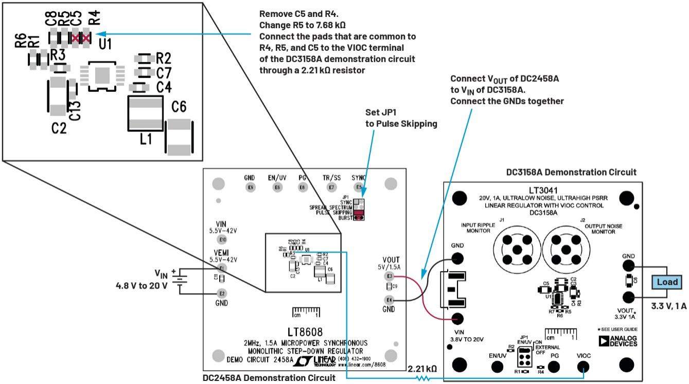 圖7.兩個演示電路,只需極少量改動即可快速測試VIOC工作情況(使用DC3158A和DC2458A)