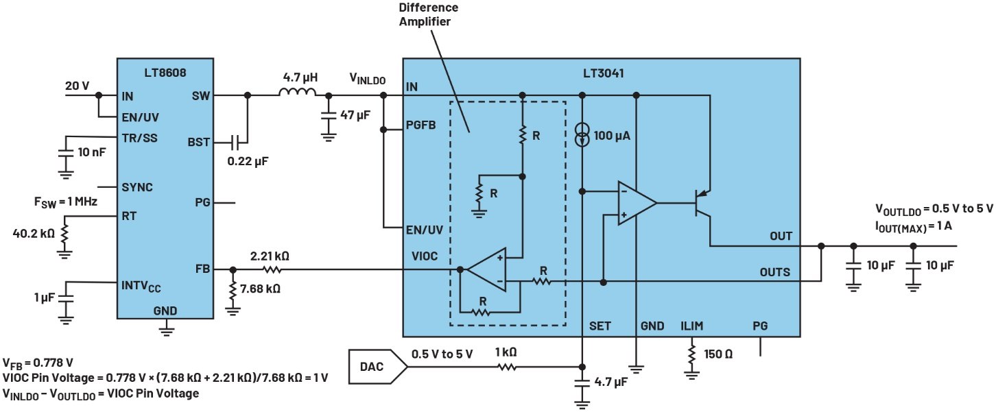 為了理解差分放大器如何實現(xiàn)VIOC,可將差分放大器的輸出視為其輸入之一。如果差分放大器的輸出電壓為某個特定值,則其正輸入端的電壓必須高于其負輸入端的電壓,且高出幅度必須等于該差分放大器輸出電壓。差分放大器的負輸入端連接到LDO的輸出端,因此差分放大器可調(diào)節(jié)開關(guān)穩(wěn)壓器的輸出電壓,使其比LDO的輸出電壓高,高出的量值與差分放大器輸出電壓(由開關(guān)穩(wěn)壓器的FB引腳電壓決定)相同。