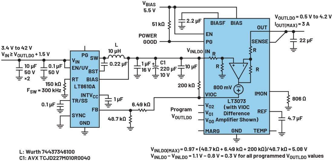 圖9.使用分立器件LT8646S和LT3083實現(xiàn)VIOC的電路