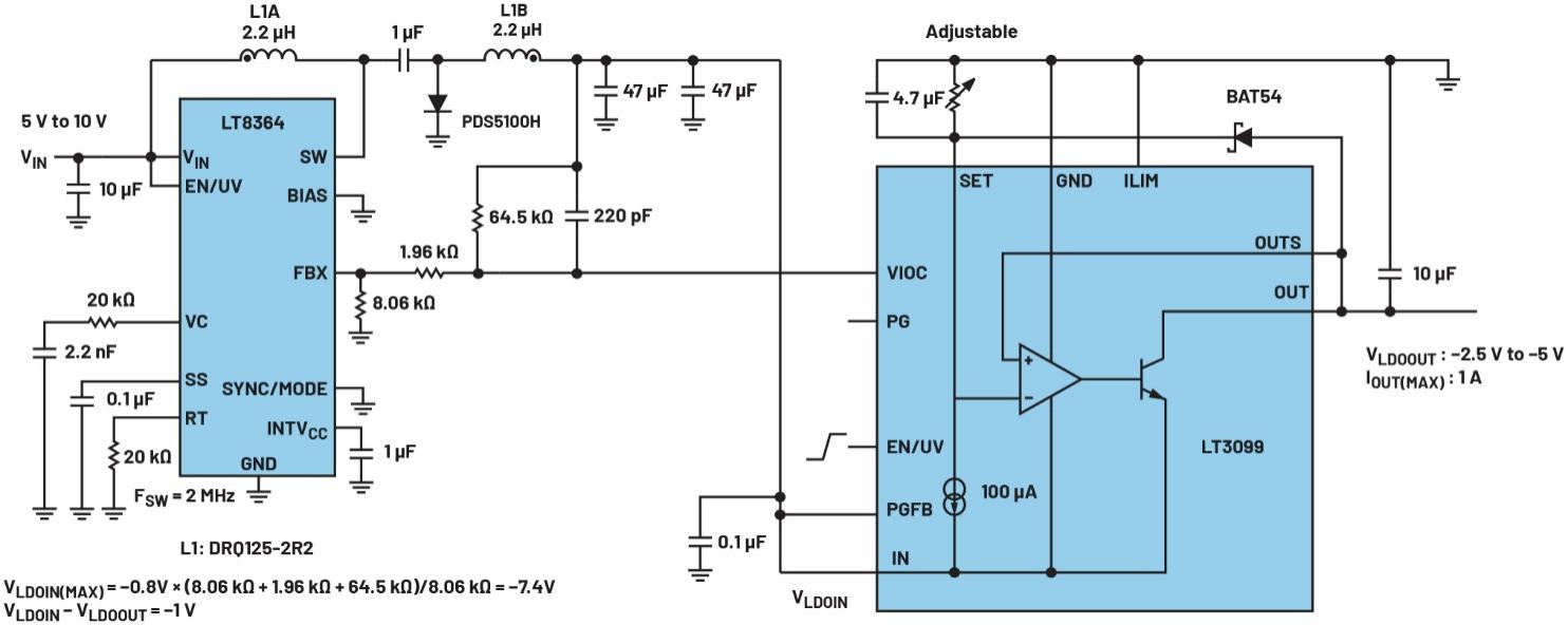 圖4.采用?uk配置的開關(guān)穩(wěn)壓器,用于產(chǎn)生負電壓(使用LT8364)