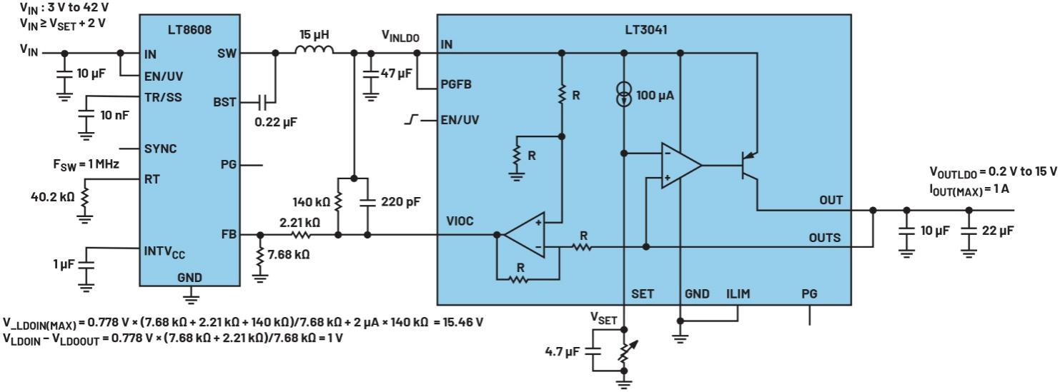 圖2.LT3073 LDO具有VIOC電路設(shè)計,可使LDO的輸入輸出電壓差低于開關(guān)穩(wěn)壓器反饋引腳電壓,并限制LT8610A開關(guān)穩(wěn)壓器的輸出電壓