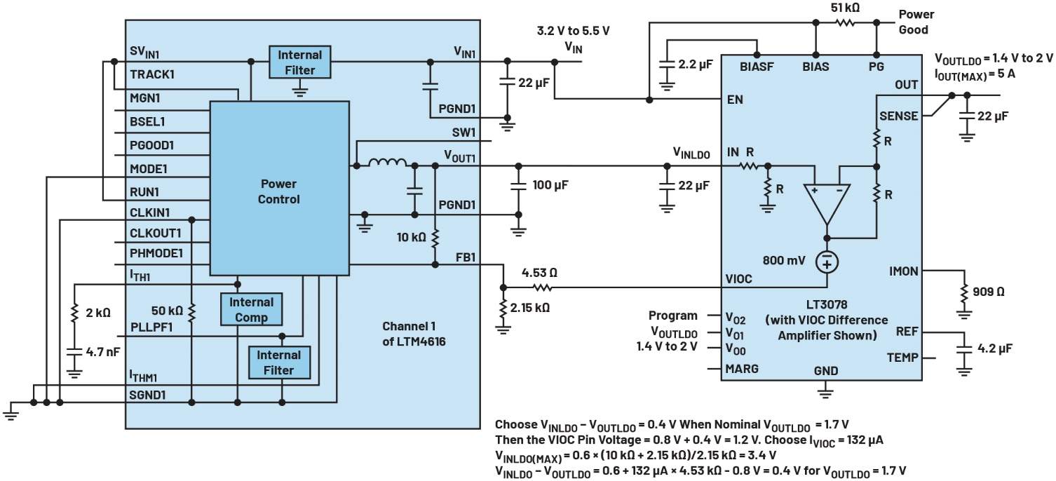 圖6.此VIOC電路將LTM4616 μModule穩(wěn)壓器的一個通道與LT3078 LDO配合使用